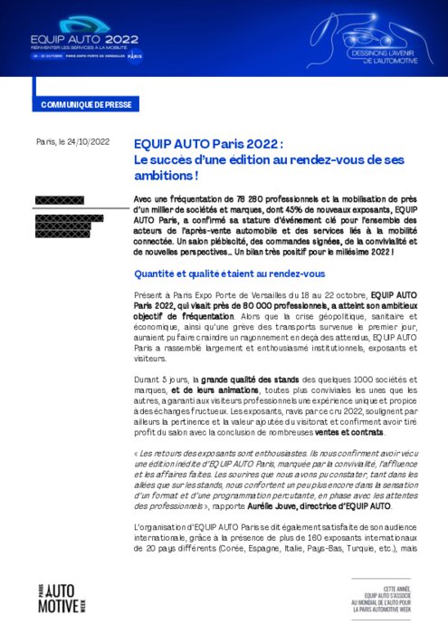 Avec une fréquentation de 78 280 professionnels et la mobilisation de près d’un millier de sociétés et marques, dont 45% de nouveaux exposants, EQUIP AUTO Paris, a confirmé sa stature d’événement clé pour l’ensemble des acteurs de l’après-vente automobile et des services liés à la mobilité connectée. Un salon plébiscité, des commandes signées, de la convivialité et de nouvelles perspectives... Un bilan très positif.