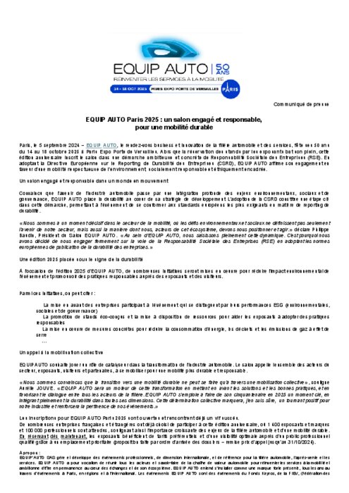 EQUIP AUTO, le rendez-vous business et innovation de la filière automobile et des services, fête ses 50 ans du 14 au 18 octobre 2025 à Paris Expo Porte de Versailles. Alors que la réservation des stands par les exposants bat son plein, cette édition anniversaire inscrit le salon dans une démarche ambitieuse et concrète de Responsabilité Sociétale des Entreprises (RSE). En adoptant la Directive Européenne sur le Reporting de Durabilité des Entreprises (CSRD), EQUIP AUTO affirme son engagement en faveur d'une mobilité respectueuse de l'environnement, socialement responsable et éthiquement encadrée.