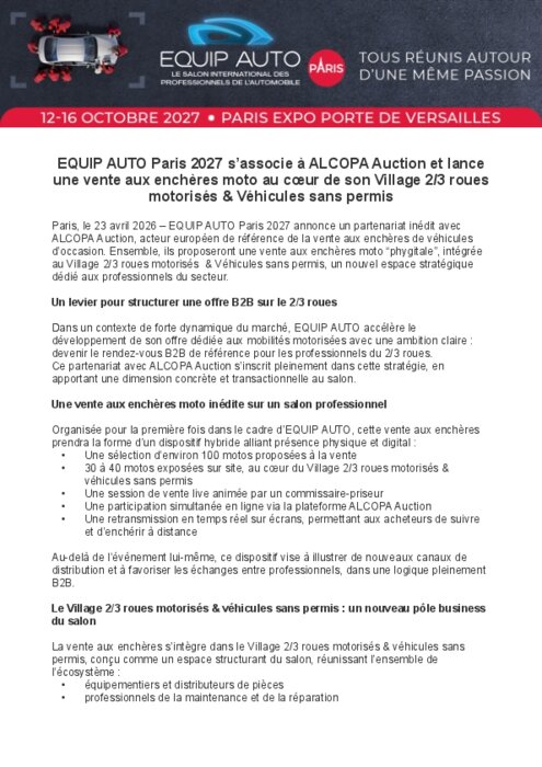 Equip Auto Paris 2027 annonce un partenariat inédit avec Alcoa Auction, acteur européen de référence de la vente aux enchères de véhicules d’occasion. Ensemble, ils proposeront une vente aux enchères moto “phygitale”, intégrée au Village 2/3 roues motorisés & Véhicules sans permis, un nouvel espace stratégique dédié aux professionnels du secteur.