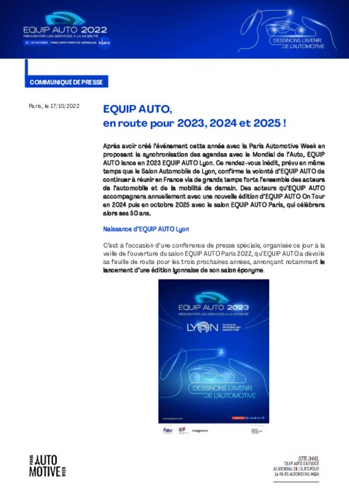 EQUIP AUTO lance en 2023 EQUIP AUTO Lyon. Ce rendez-vous inédit, prévu en même temps que le Salon Automobile de Lyon, confirme la volonté d’EQUIP AUTO de continuer à réunir en France via de grands temps forts l’ensemble des acteurs de l’automobile et de la mobilité de demain. Des acteurs qu’EQUIP AUTO accompagnera annuellement avec une nouvelle édition d’EQUIP AUTO On Tour en 2024 puis en octobre 2025 avec le salon EQUIP AUTO Paris, qui célèbrera alors ses 50 ans.