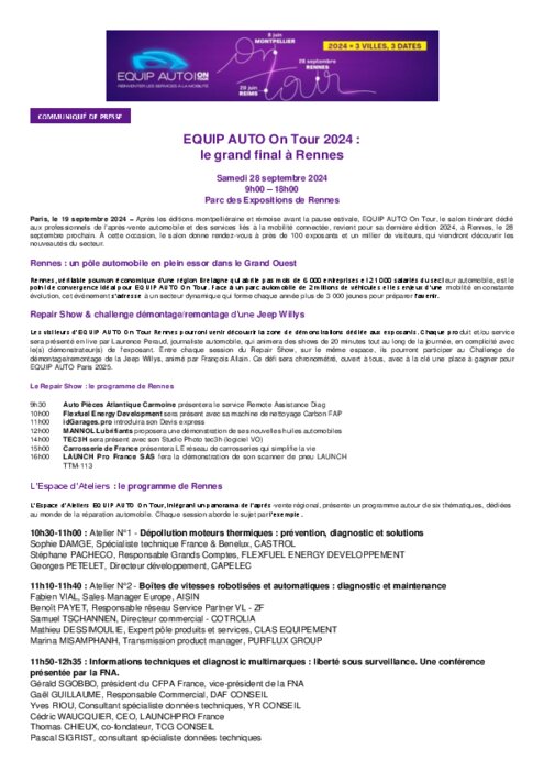 Après les éditions montpelliéraine et rémoise avant la pause estivale, Equip Auto On Tour, le salon itinérant dédié aux professionnels de l'après-vente automobile et des services liés à la mobilité connectée, revient pour sa dernière édition 2024, à Rennes, le 28 septembre prochain. À cette occasion, le salon donne rendez-vous à près de 100 exposants et un millier de visiteurs, qui viendront découvrir les nouveautés du secteur.