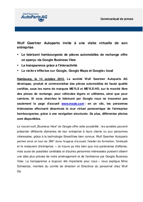 La société Wulf Gaertner Autoparts développe, produit et commercialise des pièces automobiles de haute qualité certifiée, sous les noms de marques MEYLE et MEYLE-HD, sur le marché libre des pièces de rechange, pour véhicules légers et utilitaires, ainsi que pour camions. Si vous cherchez le fabricant par Google vous ne trouverez pas seulement la page d'accueil www.meyle.com : en un clic, les personnes intéressées effectuent désormais le tour virtuel panoramique de l'entreprise hambourgeoise.