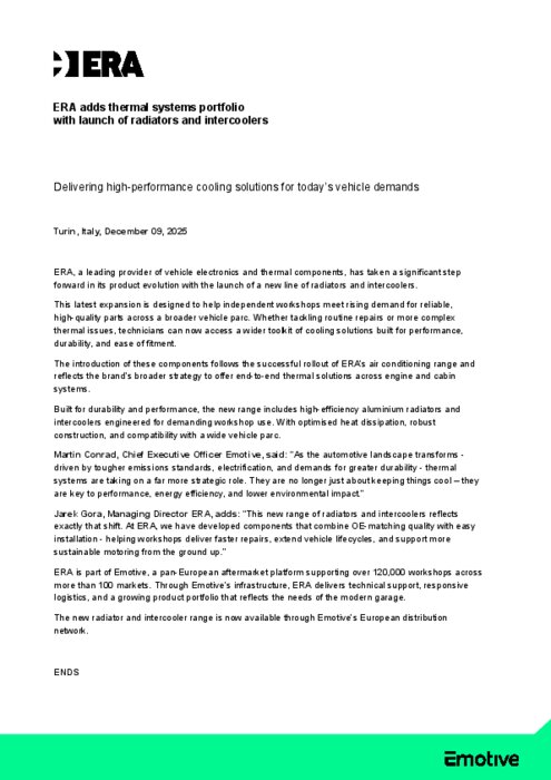 ERA, l'un des principaux fournisseurs de composants électroniques et thermiques pour véhicules, a franchi une étape importante dans l'évolution de ses produits avec le lancement d'une nouvelle gamme de radiateurs et de refroidisseurs intermédiaires. Cette dernière extension vise à aider les ateliers indépendants à répondre à la demande croissante de pièces fiables et de haute qualité pour un parc automobile plus large.