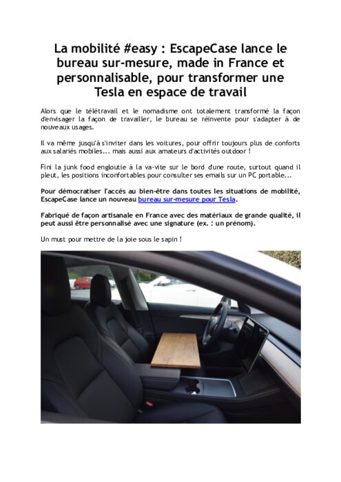 Spécialement conçu pour les Tesla Model 3 et Y, ce bureau s'intègre harmonieusement à l'intérieur de l'habitacle, du côté conducteur ou passager, pour allier design et praticité. Les conducteurs profitent ainsi d'un espace de travail mobile pour gérer leurs dossiers, naviguer sur Internet, regarder des vidéos, lire, ou manger en étant bien installés.