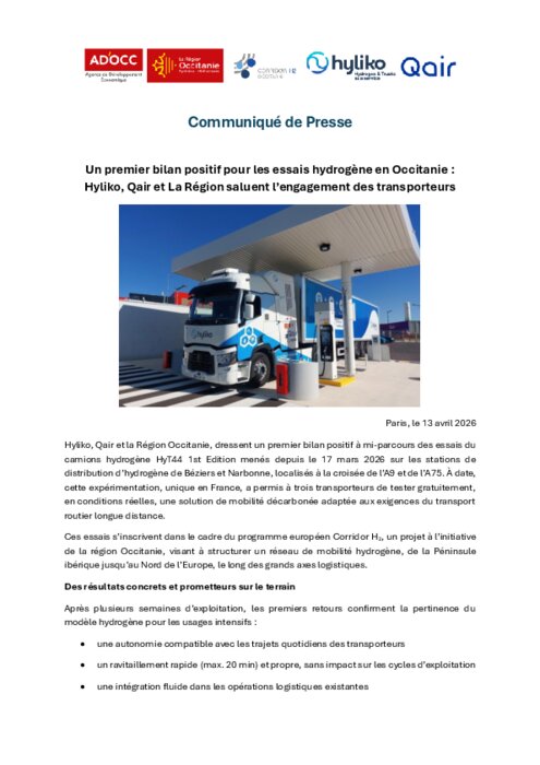 Hyliko, Qairet la Région Occitanie, dressent un premier bilan positif à mi-parcours des essais du camions hydrogène HyT441st Edition menés depuis le 17 mars2026 sur les stations de distribution d’hydrogène de Béziers et Narbonne, localisés à la croisée de l’A9 et de l’A75. À date, cette expérimentation, unique en France, a permis à trois transporteurs de tester gratuitement, en conditions réelles, une solution de mobilité décarbonée adaptée aux exigences du transport routier longue distance.