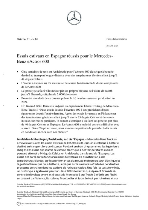Mercedes-Benz Trucks a achevé avec succès les essais estivaux de l'eActros 600, camion électrique à batterie destiné au transport longue distance. Pendant environ cinq semaines, les ingénieurs chargés des essais ont soumis ce camion électrique à des températures élevées pouvant atteindre 44 degrés Celsius en Andalousie, dans le sud de l'Espagne.