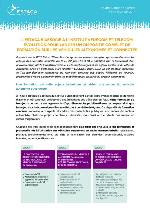 Présente sur le 12ème Salon ITS de Strasbourg, le rendez-vous européen qui rassemble tous les acteurs des nouvelles mobilités du 19 au 22 juin, l'ESTACA, école d'ingénieurs spécialisée dans les transports, a officialisé la création d'un nouveau dispositif de formation continue sur les technologies et les enjeux sociétaux du véhicule autonome et connecté.