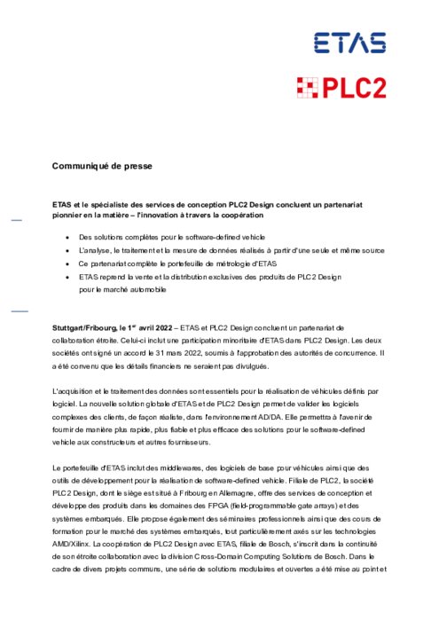 ETAS et le spécialiste des services de conception PLC2 Design concluent un partenariat pionnier en la matière – l'innovation à travers la coopération, via : Des solutions complètes pour le software-defined. L’analyse, le traitement et la mesure de données réalisés à partir d'une seule et même source. Ce partenariat complète le portefeuille de métrologie d'ETAS et reprend la vente et la distribution exclusives des produits de PLC2 Design pour le marché automobile.