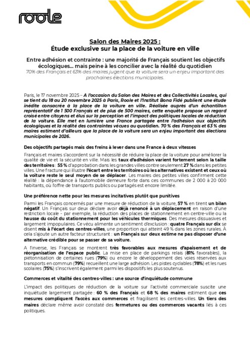 A l’occasion du Salon des Maires et des Collectivités Locales, qui se tient du 18 au 20 novembre à Paris, Roole et l’Institut Bona Fidé publient une étude inédite consacrée à la place de la voiture en ville. Réalisée auprès d’un échantillon représentatif de 1 500 Français et de plus de 500 maires, cette enquête propose un regard croisé entre citoyens et élus sur la perception et l’impact des politiques locales de réduction de la voiture. Elle met en lumière une France partagée entre l’adhésion aux objectifs écologiques et la réalité des contraintes vécues au quotidien. 70 % des Français et 63 % des maires estiment d’ailleurs que la place de la voiture sera un enjeu important des élections municipales.