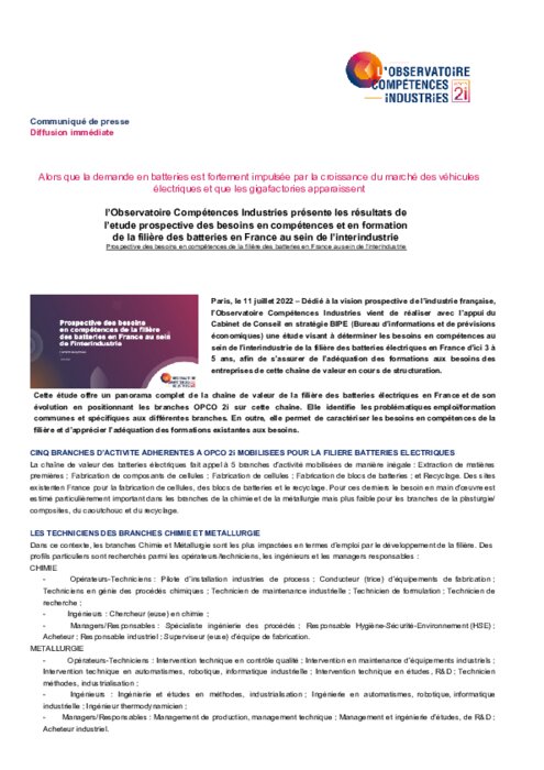 économiques) une étude visant à déterminer les besoins en compétences au sein de l’interindustrie de la filière des batteries électriques en France d’ici 3 à 5 ans, afin de s’assurer de l’adéquation des formations aux besoins des entreprises de cette chaîne de valeur en cours de structuration.