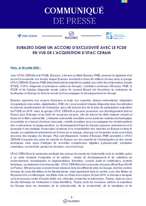 Constructeurs, Services 30 juillet 2020 - 18:15 L’ambition commune d’Eurazeo PME, du FCDE et de l’équipe dirigeante d'Utac-Ceram réunie autour de Laurent Benoit est d’accélérer la croissance de l’entreprise en Europe et dans le monde et d’accompagner le développement du Groupe. PDF (346 Ko) Télécharger