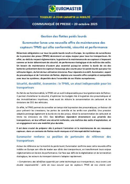 Désormais obligatoires sur tous les poids lourds neufs en Europe, les systèmes de surveillance de la pression des pneus (TPMS) deviennent un enjeu majeur pour tous les transporteurs. Pour répondre à ce défi, Euromaster, expert du pneumatique et de l’entretien de flottes, déploie une nouvelle offre complète et compatible avec tous les systèmes, disponible dans l’ensemble de ses filiales européennes.