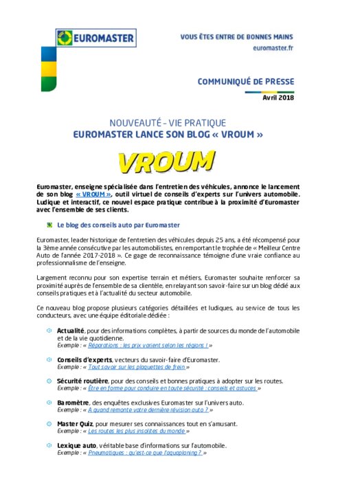 Euromaster, enseigne spécialisée dans l'entretien des véhicules, annonce le lancement de son blog " VROUM ", outil virtuel de conseils d'experts sur l'univers automobile. Ludique et interactif, ce nouvel espace pratique contribue à la proximité d'Euromaster avec l'ensemble de ses clients.