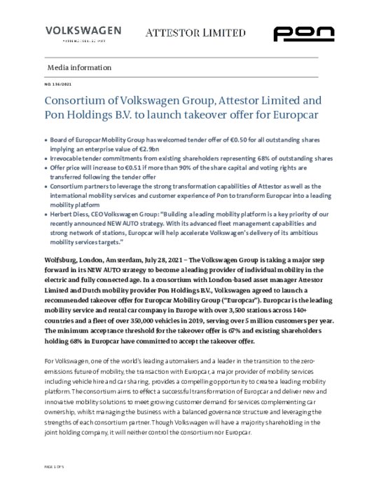 Europcar serait racheté par le N°2 mondial de l'automobile, le fonds britannique Attestor Limited, déjà actionnaire du groupe et propriétaire de la compagnie aérienne allemande Condor, et le groupe Pon, importateur du groupe Volkswagen aux Pays-Bas et aux Etats-Unis, mais aussi fabricant et loueur de vélos.