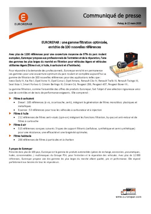 Avec plus de 1200 références pour une couverture moyenne de 97% du parc roulant européen, Eurorepar propose aux professionnels de l'entretien et de la réparation, l'une des gammes les plus larges du marché en filtration pour véhicules légers et véhicules utilitaires légers (filtres à air, à huile, à carburant et d'habitacle).