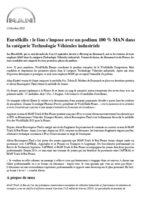 EuroSkills : podium 100 % MAN dans la catégorie Technologie Véhicules industriels