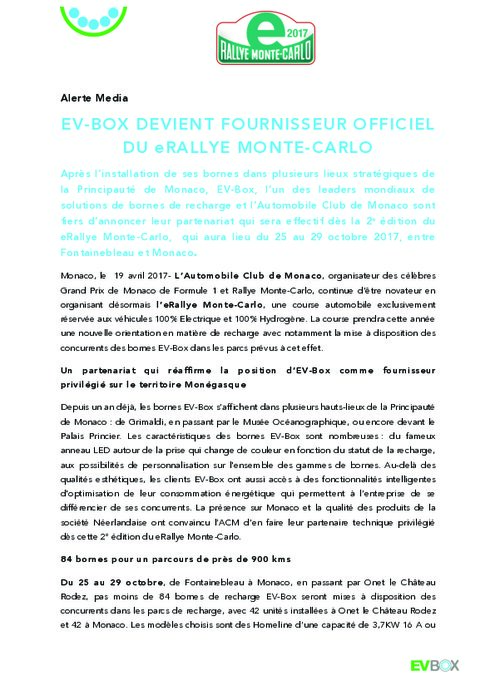 Après l'installation de ses bornes dans plusieurs lieux stratégiques de la Principauté de Monaco, EV-Box, l'un des leaders mondiaux de solutions de bornes de recharge et l'Automobile Club de Monaco sont fiers d'annoncer leur partenariat qui sera effectif dès la 2e édition du eRallye Monte-Carlo, qui aura lieu du 25 au 29 octobre 2017, entre Fontainebleau et Monaco.