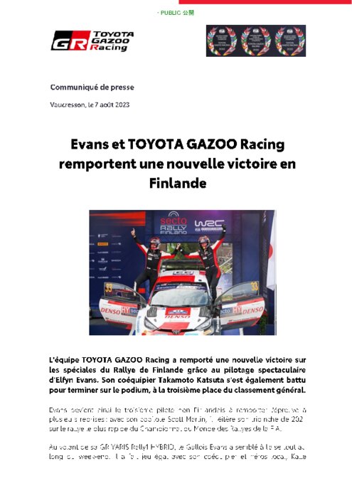 L'équipe TOYOTA GAZOO Racing a remporté une nouvelle victoire sur les spéciales du Rallye de Finlande grâce au pilotage spectaculaire d'Elfyn Evans. Son coéquipier Takamoto Katsuta s'est également battu pour terminer sur le podium, à la troisième place du classement général.