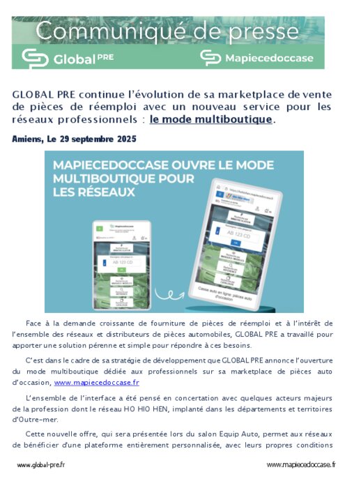 Face à la demande croissante de fourniture de pièces de réemploi et à l’intérêt de l’ensemble des réseaux et distributeurs de pièces automobiles, GLOBAL PRE a travaillé pour apporter une solution pérenne et simple pour répondre à ces besoins.