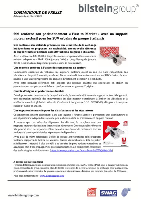 febi confirme son statut de précurseur sur le marché de la rechange indépendante en proposant, en exclusivité, une nouvelle référence de support moteur destinée aux SUV urbains du groupe Stellantis. Avec la référence febi 196965, les professionnels disposent désormais d’une solution adaptée aux FIAT 500X (depuis 2014) et Jeep Renegade (depuis 2018), deux modèles largement présents dans le parc roulant.