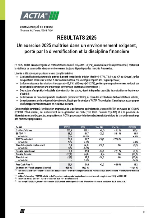 En 2025, ACTIA Group enregistre un chiffre d’affaires stable à 535,4 M€, en légère progression de +0,1 % par rapport à 2024, conformément à son objectif de stabilisation dans un environnement toujours dégradé pour les marchés Automotive. Dans ce contexte, le Groupe démontre sa capacité à adapter son modèle opérationnel, en s’appuyant sur la diversification de ses activités et sur les actions engagées pour améliorer sa structure de coûts et sa génération de cash.