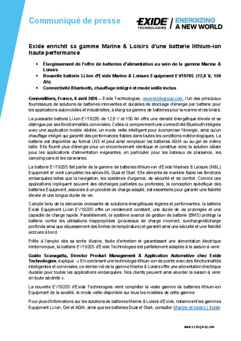Exide Technologies, l'un des principaux fournisseurs de solutions de batteries innovantes et durables de stockage d’énergie par batterie pour les applications automobiles et industrielles, a élargi sa gamme de batteries pour la marine et les loisirs.