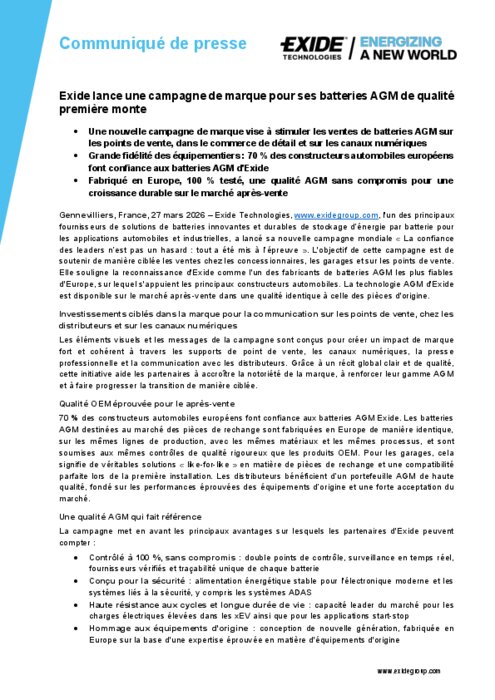 Exide lance une campagne de marque pour ses batteries AGM de qualité première monte
