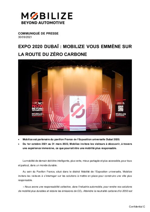 Mobilize est partenaire du pavillon France de l’Exposition universelle Dubaï 2020. Du 1er octobre 2021 au 31 mars 2022, Mobilize invitera les visiteurs à découvrir, à travers