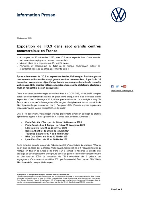 Exposition de l'ID.3 dans sept grands centres commerciaux en France