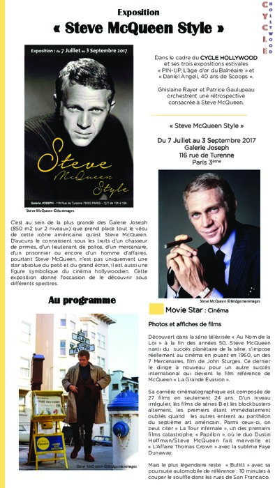 C’est au sein de la plus grande des Galerie Joseph que prend place le vécu de cette icône américaine qu’est Steve McQueen. D’aucuns le connaissent sous les traits d’un chasseur de primes, d’un lieutenant de police, d’un mercenaire, d’un prisonnier ou encore d’un homme d’affaires, pourtant Steve McQueen, n’est pas uniquement une star absolue du petit et du grand écran, il est aussi une figure symbolique du cinéma hollywoodien. Cette exposition aura lieu du 7 juillet au 3 septembre.