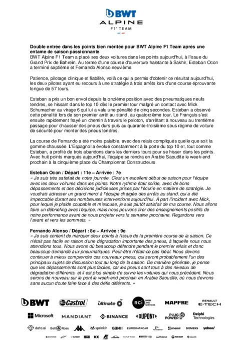 Constructeurs 20 mars 2022 - 22:01 BWT Alpine F1 Team a placé ses deux voitures dans les points aujourd'hui, à l'issue du Grand Prix de Bahreïn. Au terme d'une course d'ouverture haletante à Sakhir, Esteban Ocon a terminé septième et Fernando Alonso neuvième. PDF (179 Ko) Télécharger