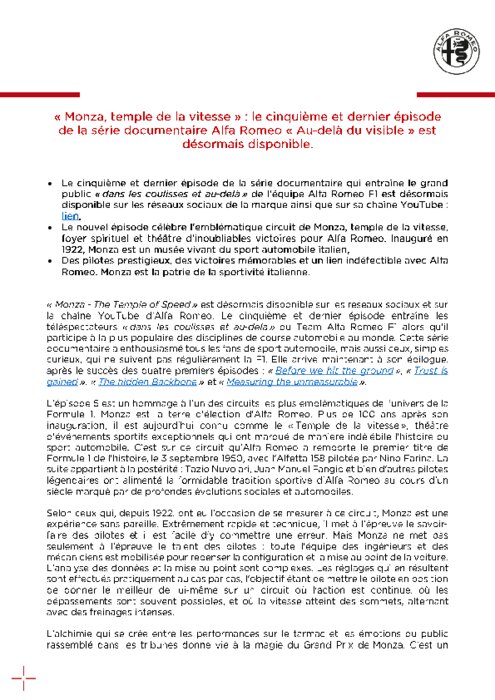 Ce nouvel épisode célèbre l'emblématique circuit de Monza, temple de la vitesse, foyer spirituel et théâtre d'inoubliables victoires pour Alfa Romeo. Inauguré en 1922, Monza est un musée vivant du sport automobile italien. Des pilotes prestigieux, des victoires mémorables et un lien indéfectible avec Alfa Romeo. Monza est la patrie de la sportivité italienne.