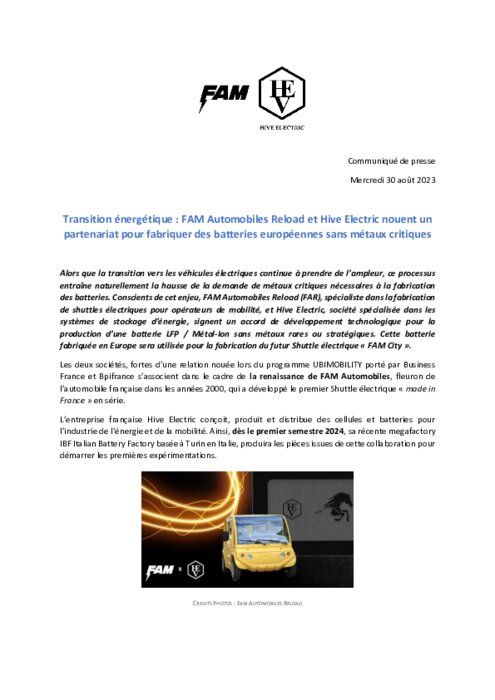 Alors que la transition vers les véhicules électriques continue à prendre de l’ampleur, ce processus entraîne naturellement la hausse de la demande de métaux critiques nécessaires à la fabrication des batteries. Conscients de cet enjeu, FAM Automobiles Reload (FAR), spécialiste dans la fabrication de shuttles électriques pour opérateurs de mobilité, et Hive Electric, société spécialisée dans les systèmes de stockage d’énergie, signent un accord de développement technologique pour la production d’une batterie LFP / Métal-Ion sans métaux rares ou stratégiques.
