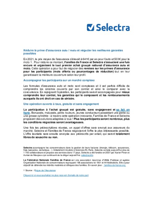 En 2021, le prix moyen de l’assurance s’élevait à 641€ par an pour l’auto et 503€ pour la moto 1. Pour réduire ce montant, Familles de France et Selectra s’associent une fois encore et organisent le tout premier achat groupé national d’assurance auto et moto. Cette opération a pour but de négocier des remises sur les primes d’assurance pour les participants (mois offerts ou pourcentages de réduction) tout en leur garantissant la meilleure couverture selon leur profil.