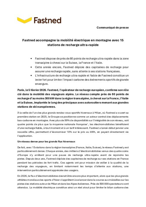 Fastned, l’opérateur de recharge européen, confirme son rôle clé dans la mobilité des voyageurs alpins. Le réseau compte près de 80 points de recharge d’au moins 300 kW dans la région transalpine, à cheval sur la France, l’Italie et la Suisse, implantés le long des principaux axes autoroutiers menant aux grandes stations de ski européennes.
