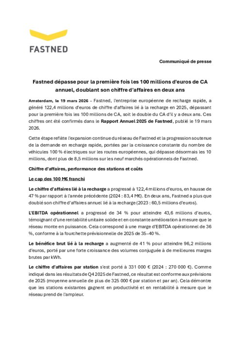 Fastned, l'entreprise européenne de recharge rapide, a généré 122,4 millions d'euros de chiffre d'affaires lié à la recharge en 2025, dépassant pour la première fois les 100 millions de CA, soit le double du CA d’il y a deux ans. Ces chiffres ont été confirmés dans le rapport annuel2025 de Fastned, publié le 19 mars 2026.