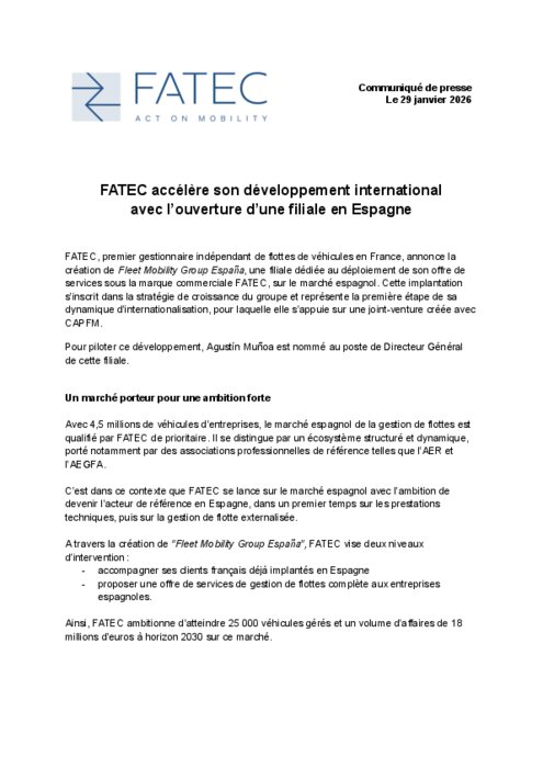 FATEC, premier gestionnaire indépendant de flottes de véhicules en France, annonce la création de Fleet Mobility Group España, une filiale dédiée au déploiement de son offre de services sous la marque commerciale FATEC, sur le marché espagnol. Cette implantation s’inscrit dans la stratégie de croissance du groupe et représente la première étape de sa dynamique d’internationalisation, pour laquelle elle s’appuie sur une joint-venture créée avec CAPFM.