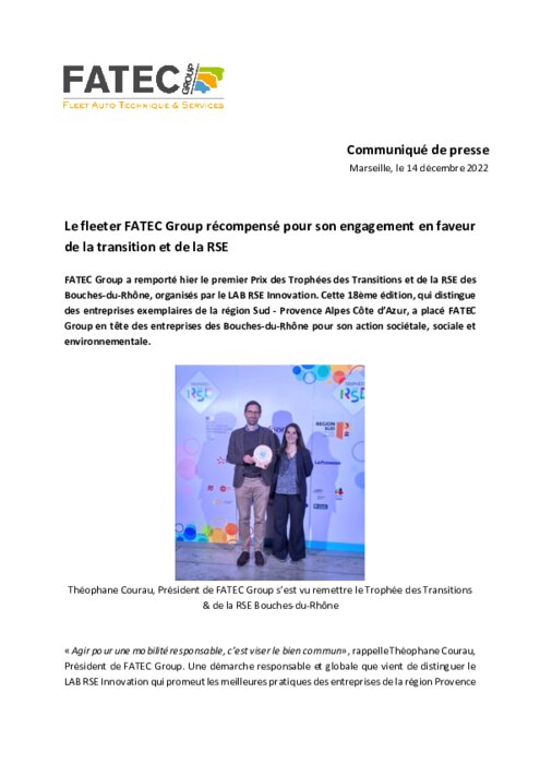 FATEC Group a remporté hier le premier Prix des Trophées des Transitions et de la RSE des Bouches-du-Rhône, organisés par le LAB RSE Innovation. Cette 18ème édition, qui distingue des entreprises exemplaires de la région Sud - Provence Alpes Côte d’Azur, a placé FATEC Group en tête des entreprises des Bouches-du-Rhône pour son action sociétale, sociale et environnementale.