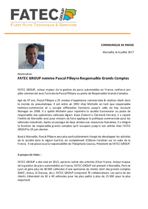 Services 06 juillet 2017 - 16:02 Fatec Group, acteur majeur de la gestion de parcs automobiles en France, renforce son pôle commercial avec l'arrivée de Pascal Pilleyre au poste de Responsable Grands Comptes. PDF (527 Ko) Télécharger