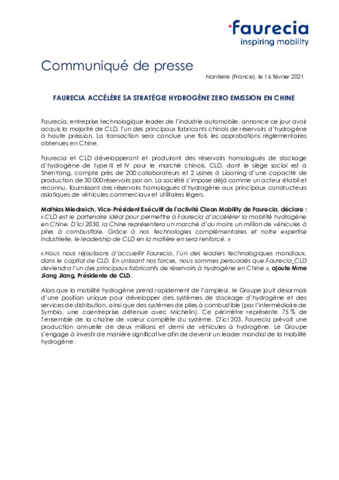Faurecia, entreprise technologique leader de l'industrie automobile, annonce ce jour avoir acquis la majorité de CLD, l'un des principaux fabricants chinois de réservoirs d'hydrogène à haute pression. La transaction sera conclue une fois les approbations réglementaires obtenues en Chine.