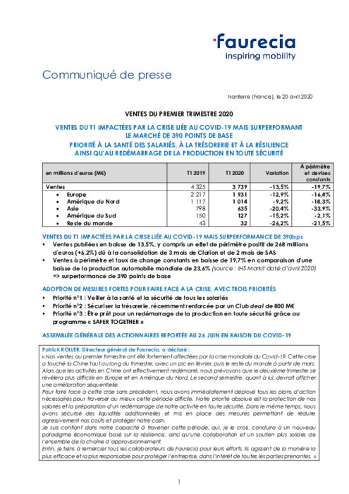Les ventes de l'équipementier automobile français Faurecia ont chuté de 13,5% au premier trimestre, fortement affectées par la crise du Covid-19 mais moins que l'ensemble du marché, alors que le groupe espère renouer avec la génération de trésorerie au second semestre.
