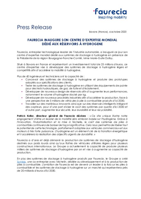 A l'occasion de l'inauguration, le directeur général de Faurecia, Patrick Koller, a annoncé la création d'une unité de "fabrication en grande série" de réservoirs à hydrogène à Etupes (Doubs) fin 2023, représentant un autre investissement de "50 millions d'euros", a-t-il précisé dans son discours.