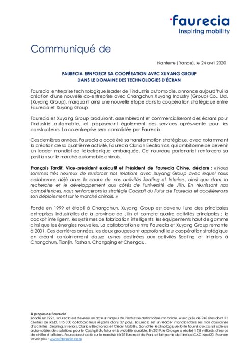 Faurecia, entreprise technologique leader de l’industrie automobile, annonce aujourd'hui la création d'une nouvelle co-entreprise avec Changchun Xuyang Industry (Group) Co., Ltd. (Xuyang Group), marquant ainsi une nouvelle étape dans la coopération stratégique entre Faurecia et Xuyang Group.