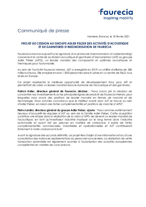 Faurecia a annoncé jeudi la signature d'un protocole avec Adler Pelzer (APG), spécialisé dans les composants et systèmes acoustiques et thermiques pour l'automobile, qui compte 11.000 salariés pour un chiffre d'affaires 1,4 milliard d'euros en 2019.