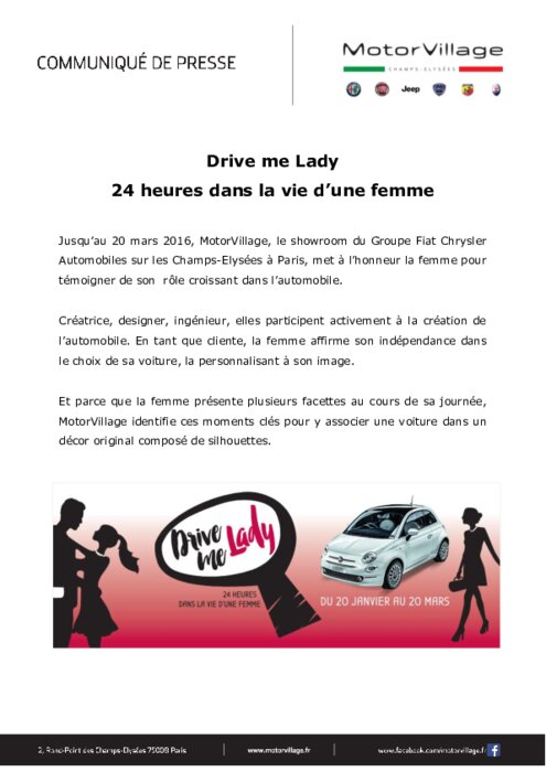 Jusqu’au 20 mars 2016, MotorVillage, le showroom du Groupe Fiat Chrysler Automobiles sur les Champs-Elysées à Paris, met à l’honneur la femme pour témoigner de son rôle croissant dans l’automobile. Créatrice, designer, ingénieur, elles participent activement à la création de l’automobile. En tant que cliente, la femme affirme son indépendance dans le choix de sa voiture, la personnalisant à son image.