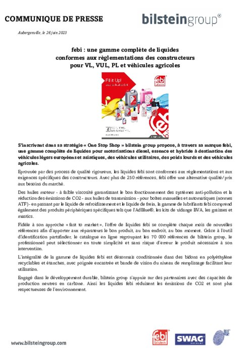 S’inscrivant dans sa stratégie « One Stop Shop » Bilstein group propose, à travers sa marque Febi, une gamme complète de liquides pour motorisations diesel, essence et hybride à destination des véhicules légers européens et asiatiques, des véhicules utilitaires, des poids lourds et des véhicules agricoles. Eprouvée par des process de qualité rigoureux, les liquides Febi sont conformes aux réglementations et aux exigences spécifiques des constructeurs. Avec plus de 250 références.
