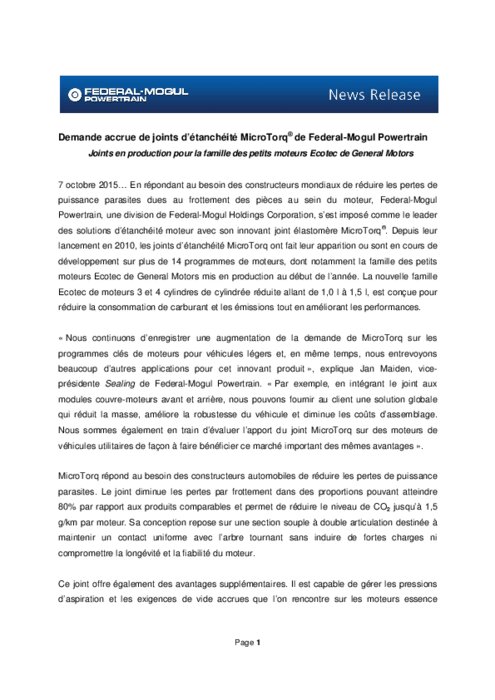 En répondant au besoin des constructeurs mondiaux de réduire les pertes de puissance parasites dues au frottement des pièces au sein du moteur, Federal-Mogul Powertrain, une division de Federal-Mogul Holdings Corporation, s’est imposé comme le leader des solutions d’étanchéité moteur avec son innovant joint élastomère MicroTorq. Depuis leur lancement en 2010, les joints d’étanchéité MicroTorq ont fait leur apparition ou sont en cours de développement sur plus de 14 programmes de moteurs.