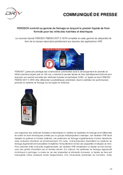 FERODO, partenaire privilégié des constructeurs automobiles dans le développement de produits de friction premium depuis plus de 100 ans, a introduit le premier liquide de frein spécifiquement formulé pour répondre aux besoins exclusifs des véhicules hybrides et électriques (VHE). Le liquide de frein FERODO FBE050 DOT 5.1EHV offre différentes caractéristiques améliorées visant à optimiser les performances globales du système de freinage sur ces types de véhicules.