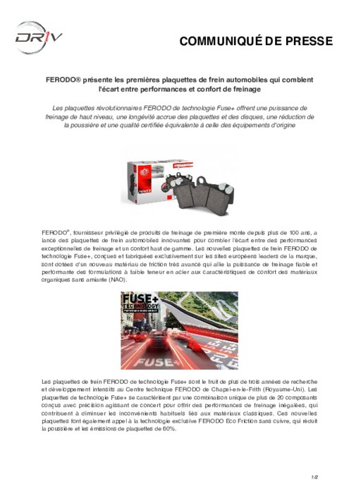 FERODO , fournisseur privilégié de produits de freinage de première monte depuis plus de 100 ans, a lancé des plaquettes de frein automobiles innovantes pour combler l'écart entre des performances exceptionnelles de freinage et un confort haut de gamme. Les nouvelles plaquettes de frein FERODO de technologie Fuse+, conçues et fabriquées exclusivement sur les sites européens leaders de la marque, sont dotées d'un nouveau matériau de friction très avancé...