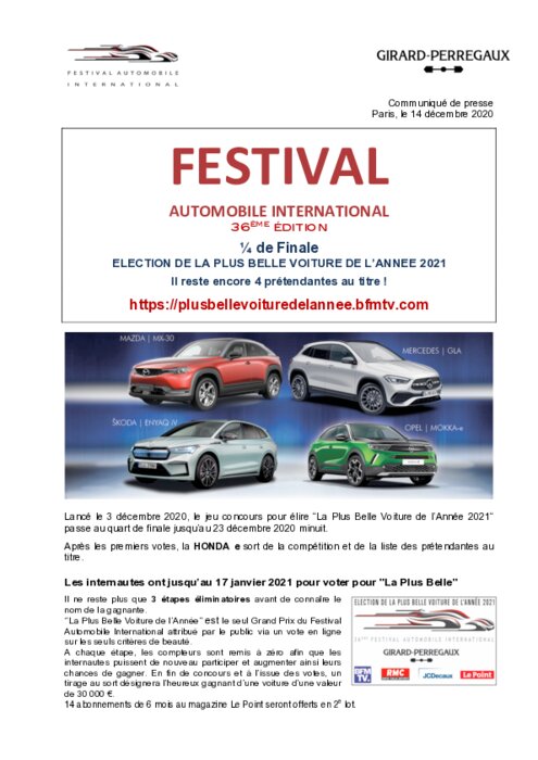 Lancé le 3 décembre 2020, le jeu concours pour élire “La Plus Belle Voiture de l’Année 2021“ passe au quart de finale jusqu’au 23 décembre 2020 minuit. Après les premiers votes, la HONDA e sort de la compétition et de la liste des prétendantes au titre.